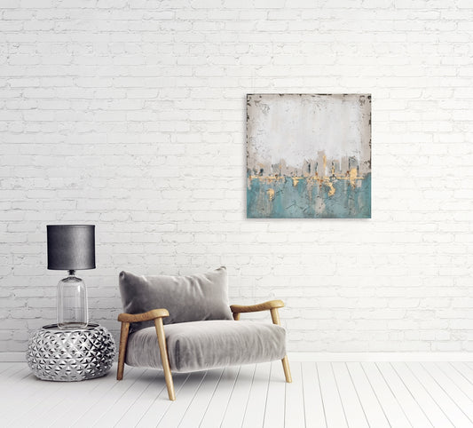 Handgemaltes Acrylgemälde auf Leinwand „Abstrakte Skyline in Türkis“