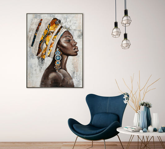 Hangemaltes Acrylgemälde mit Textilelementen auf Leinwand „Schönheit mit Textilturban“