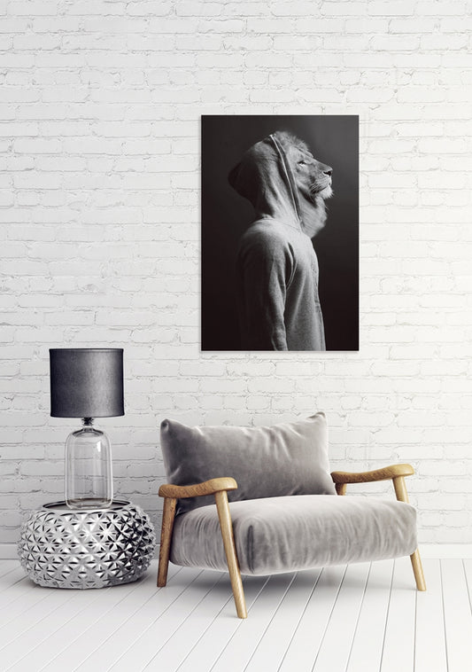 Digitaldruck-Wandbild auf Sicherheitsglas „Löwe im Hoodie“ | Rahmenloses Wandbild