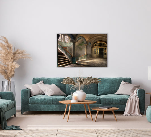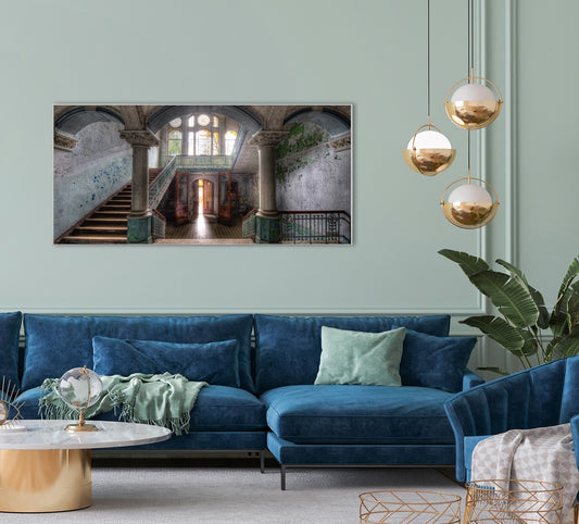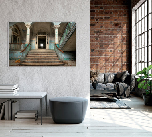 Ultra hochauflösender Digitaldruck auf hochwertiger Trägerplatte „Lost Place Treppenhaus“ | seidenmatt