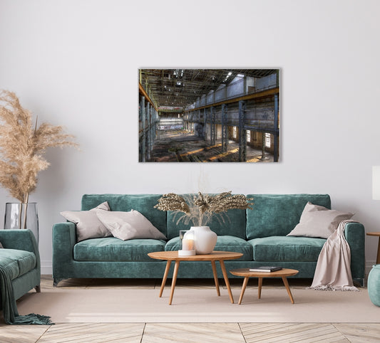 Ultra hochauflösender Digitaldruck auf hochwertiger Trägerplatte „Lost Place Halle 1“ | seidenmatt