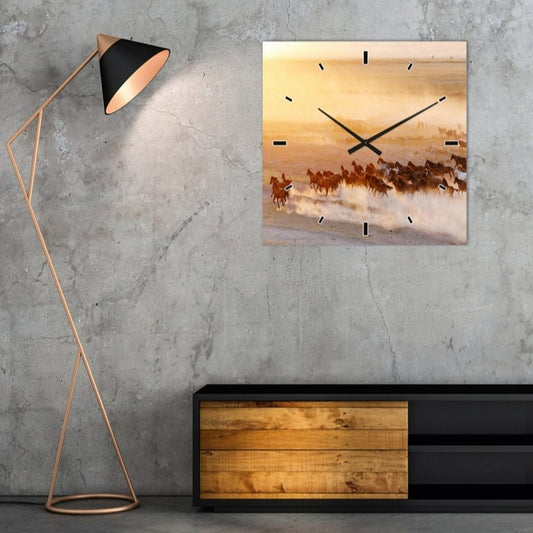 Künstlerische Wanduhr | Digitaldruck auf Sicherheitsglas | Wildpferde